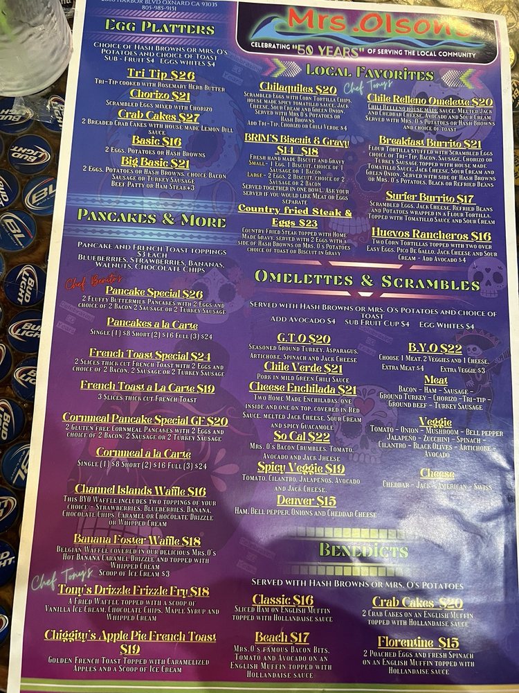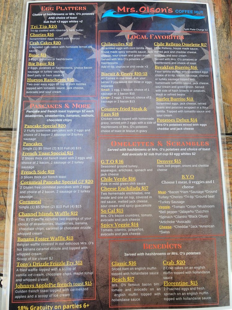Mrs. Olson's Coffee Hut, located in Oxnard, CA, is a must-visit spot for breakfast and brunch lovers. The menu offers a variety of options, including egg platters, Benedicts, and omelettes. Customer reviews praise the friendly service, generous portions, reasonable prices, and beautiful waterfront views. One satisfied customer, Michael C., had a delightful experience with his Sunday brunch, enjoying different omelettes and coffee with free refills. The customizable omelette options and diverse bread choices add a unique touch to the dining experience. With its ample seating, outdoor patio, and accommodating staff, Mrs. Olson's Coffee Hut provides a cozy and pleasant atmosphere for all visitors. Don't miss out on this gem for a delicious and fulfilling meal in Oxnard!